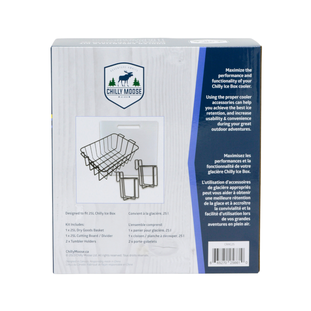 Enhance the functionality and convenience of your 25L Chilly Ice Box. This all-in-one cooler organization kit includes a food-safe cutting board that doubles as a divider, an interior dry goods basket and external drink holders.