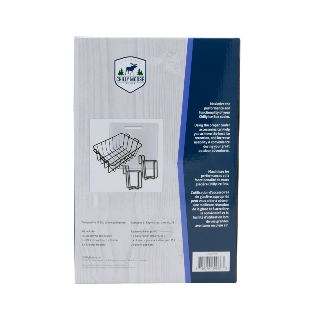 Enhance the functionality and convenience of your 35L Wheeled Explorer. This all-in-one cooler organization kit includes a food-safe cutting board that doubles as a divider, an interior dry goods basket and external drink holders.