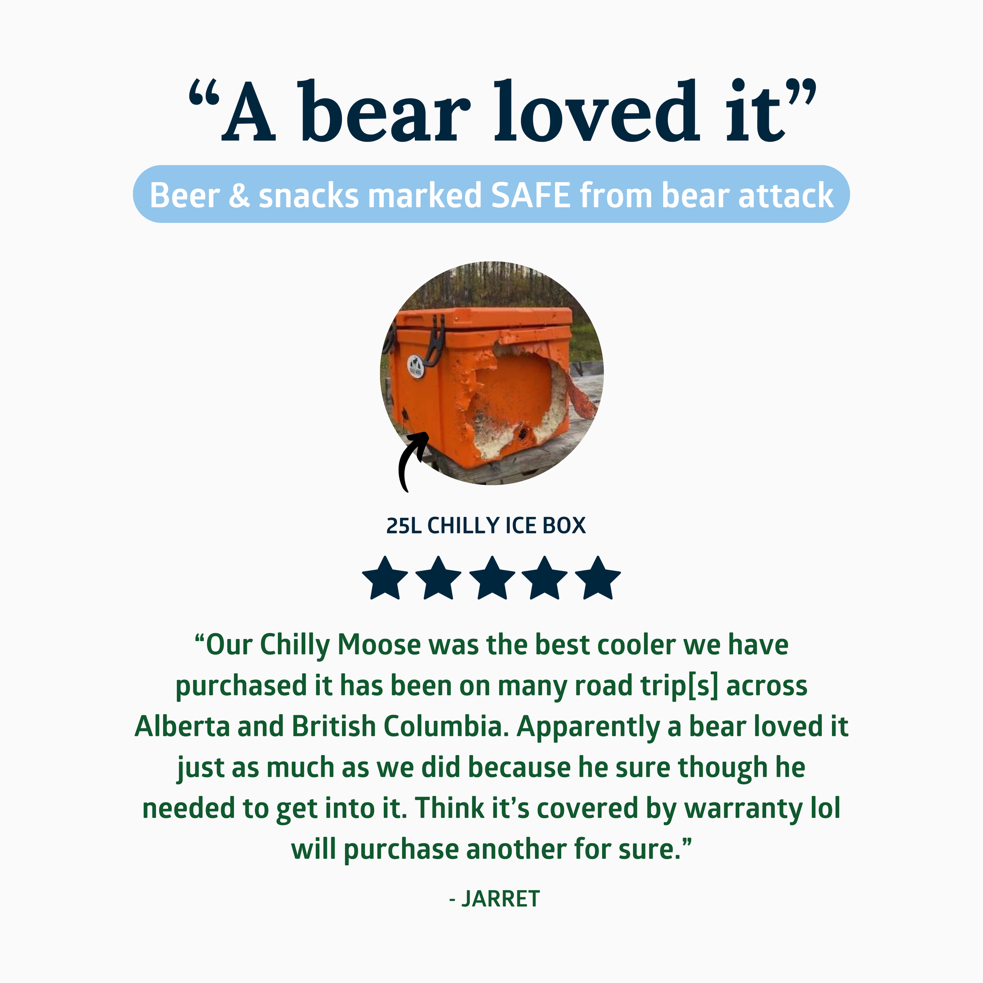 The 25L Chilly Ice Box Cooler has a form-fitted interlock lid system that keeps 400-pound predators from getting your sandwiches. Which means your ice is staying frozen and your provisions are staying put: whether you're on the water, at the campsite, or hosting the kind of dock party that gets the cops called.